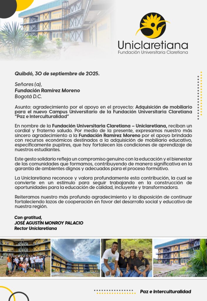 La Fundación Universitaria Claretiana – Uniclaretiana expresa su más sincero agradecimiento a la Fundación Ramírez Moreno por su valioso apoyo en la adquisición de mobiliario educativo para el nuevo Campus Universitario “Paz e Interculturalidad” en Quibdó.